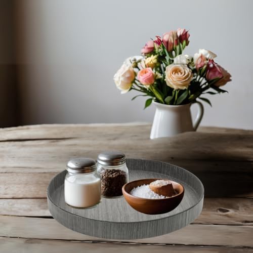 GRAY TRAY FOR COFFEE TABLE SPILLPROOF – Tired of spilled beverages? Our decorative round tray features raised edges to ensure that anything delivered on the tray does not spill and can be easily transported from one place to another. A great conversation starter and an addition to your patio, poolside, or kitchen. Round gray wood tray decor small is perfect for compact settings that demand style without sacrificing space. Its modest size makes it a charming addition to any room, offering decorative flair on a countertop or as a gray modern round tray centerpiece on your dining table.