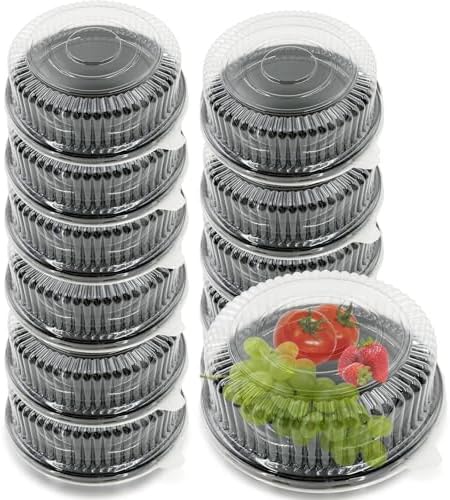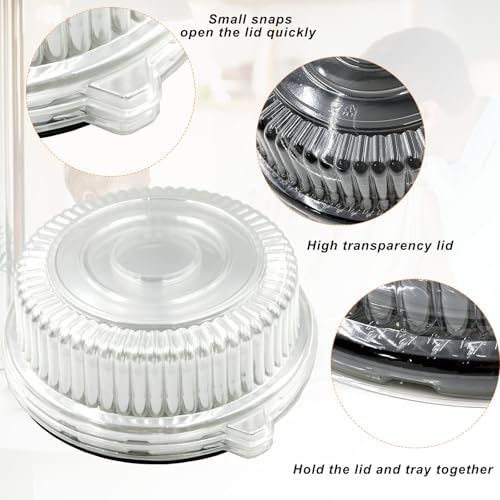 Value Pack: Includes 12 black round bases and 12 clear lids, each plastic serving tray measures 12 inches in diameter and 3.5 inches in height
