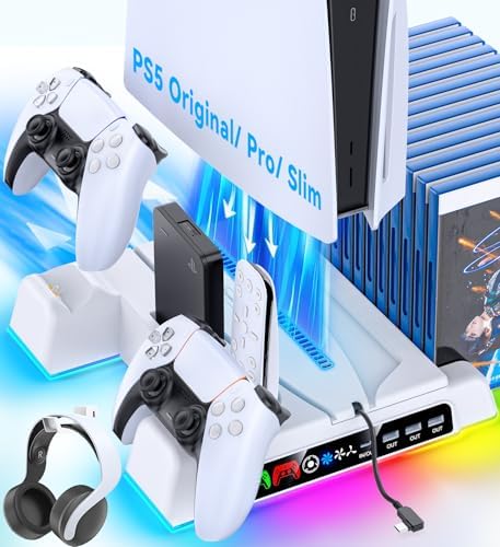 Multi-In One PS5 Accessories Organizer:The playstation 5 stand is equipped with a high efficiency cooling fan, fits playstation 5 Digital/Disc consoles, dual ps5 controller charging stations, headset stand, ps5 media remote slot, ps5 hard drive slot and 14 ps5 game cards storage. It helps save space, keeping your favorite games at your fingertips and your gaming area tidy. It’s a great choice for ps5 gamer who need a neat organizer for tons of gaming accessories.