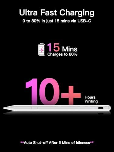[USB-C Fast Charging]- This iPad pencil charges fully within 30 minutes, charges to 80% within 15 minutes, and allows up to 10 hours of continuous use. It auto shuts down after 5 minutes of inactivity to save power