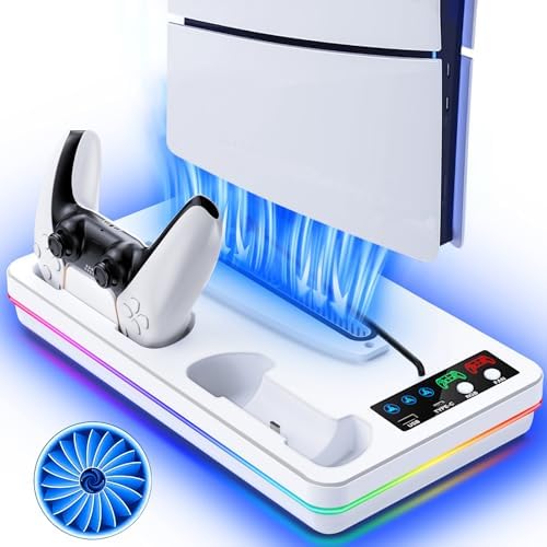 Compatible with PS5/PS5 Slim Console: This PS5 cooling station is design for 2020&2023 Slim Playstation 5 Digital Edition and Disc Edition Consoles. New upgrade PS5 cooling stand comes with a screw to lock your PS5 console to keep the ps5 gaming accessories secure and balanced. This cooling stand with station is a perfect storage for the PS5 gamer