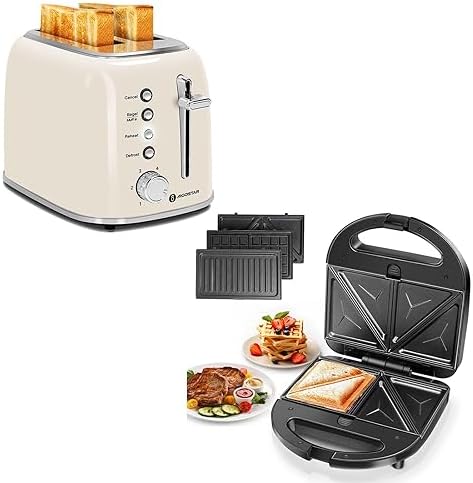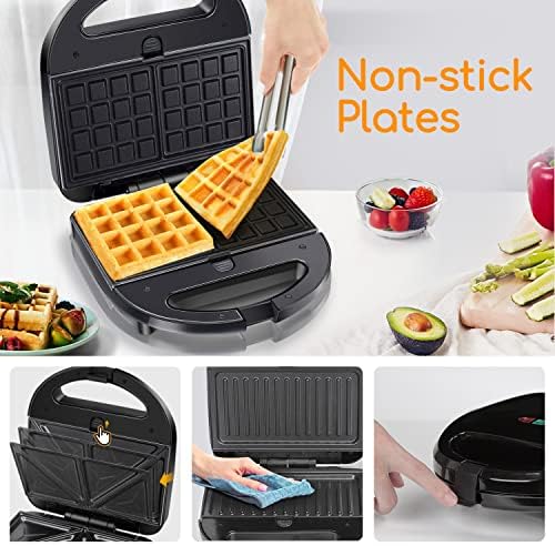 Aigostar Sandwich Maker, 3-in-1 Panini Press Indoor Grill with Detachable Non-stick Coating, Portable Electric Waffle Maker, Cool Touch Handle, Led Indicator Lights, Automatic Thermostatic System & Easy to Clean, 750 Watt, Black 3-in-1 Versatility & Make Hot Sandwiches and More The sandwich maker with removable plates presses hot sandwiches, grills omelets, and even crisps french toast fast. Expect bread slices, you can freshly toast English muffins, bagels, quesadillas inside the sandwich toaster. Simple and efficient. Our sandwich makers and panini presses is ideal for making two sandwiches or paninis, grilling burgers, steaks, veggies, bacon, chicken breast, toast pocket sandwiches, melts cheese, reheat personal pizza, egg, ham. The Aigostar panini press grill with nonstick plates can accommodate a variety of food, perfect for making breakfast, lunch, dinner, and more! Even Waffle Iron Cooking Classic waffle maker equipped with 750W motor heats up quickly, bringing you 2 slices fluffy/ crispy waffle! It can take waffle out easily, and cleaning up is not a mess for you anymore, just a damp cloth. Non-stick Coating Sandwich Grill Nonstick coating prevents food from sticking to the breakfast sandwich maker. It’s very easy to clean.