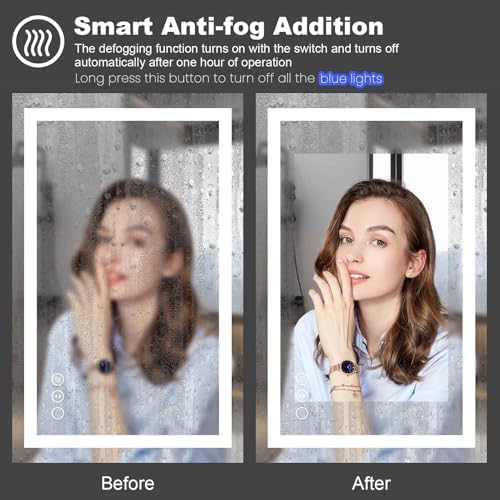 [Anti-fog]: After a few minutes of opening the defogger, the heater in the mirror will disperse the fog from the center to sides, the mirror will still reflect clearly in the bathroom surrounded by hot air; It will turn on with the power on and automatically turns off after 1 hour