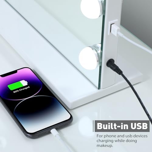 【Elegant Design and Fitting Dimensions】 The surface of the make-up mirror has a size of 23Wx18H inches(58x46cm). The size of the base is 23Wx5.4Dx1H inches(58×13.5×2.5cm).A 12V/1A USB charging port deigned in the side of the mirror frame, easy to charge your phone.