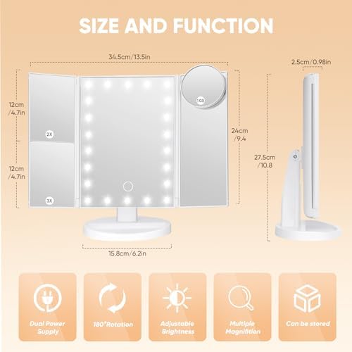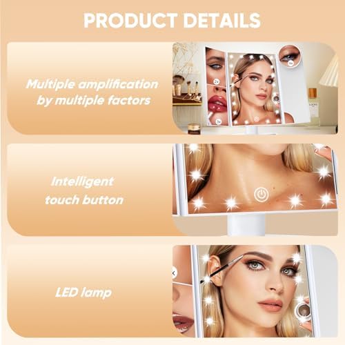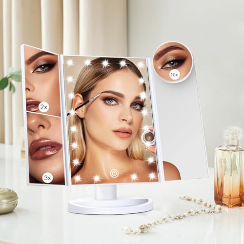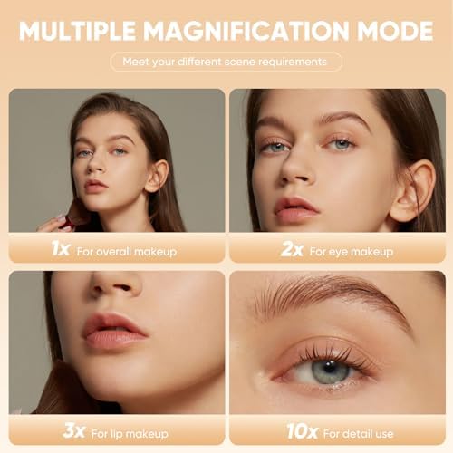 2X,3X,10X magnification modes; lighted makeup mirror has 3 panels magnifying and wide-angle viewing; see clearly your face and make a flawless makeup, suitable for desk makeup and handheld use.