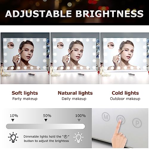【Upgraded Adjustable Brightness & 3 Colors of Light】: There are 15 LED bulbs around the lighting vanity mirror, and the 3 adjustable ranges are from cool white to warm yellow (3500-7000K). protecting your eyes.The brightness can be adjusted to meet your personal makeup needs. High lumen and life of more than 50,000 hours. Note: The LED bulb is embedded and cannot be adjusted or replaced.