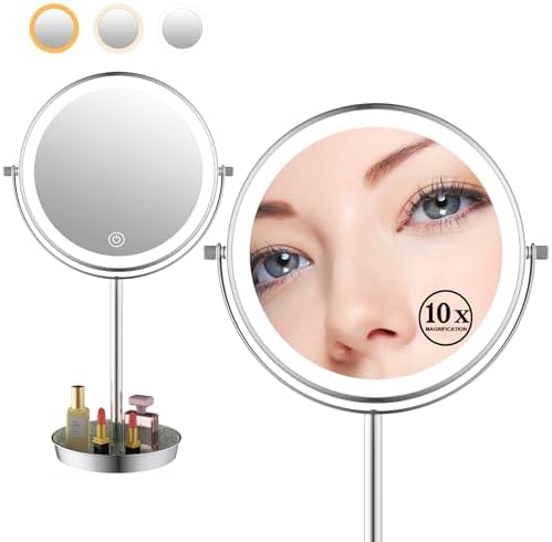 1X 10X Double sided Lighted Makeup Mirror: Double-sided vanity mirror that has 10-times and 1-times magnification to zoom in details such as eyebrow grooming and contact lens application. WARM TIPS:Keep your face 4″ from the mirror to avoid dizziness when using the 10X magnifying mirror