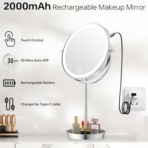 Cordless Magnifying Mirror with Light With 2000mAh rechargeable battery powered cordless design, work for more than 6 hours after fully charged. Also it has an auto-30mins auto shutoff feature to save power if you forget to turn it off