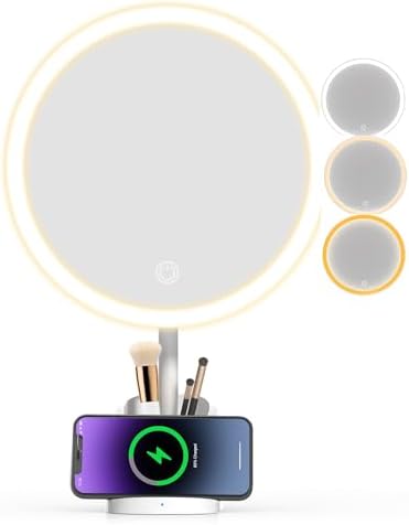[Rechargeable and Qi-Enabled Charging] This makeup mirror with lights features a built-in rechargeable lithium battery and comes with two charging cables, allowing the mirror and base to be charged simultaneously, saving time. The mirror takes only 3 to 3.5 hours to fully charge and provides up to 5.5 hours of continuous lighting, offering a stable light source whether you’re applying makeup in the morning or for touch-ups on the go. The base also supports all Qi-enabled mobile phones—simply place your phone on the holder to charge without the need for extra cables