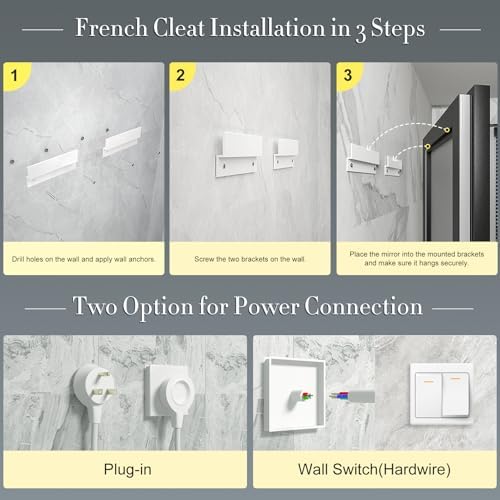 【Colors Changeable and Brightness Dimmable】This multifunctional illuminated mirror is convenient for anyone to use which is easily controlled by touching the buttons on the mirror surface. Short press each light button to change the colors(warm 3000K/neutral 4000K/white 6000K). Long press each light button to adjust the brightness. The brightness setup will be remembered for next use when it is controlled by wall switch.