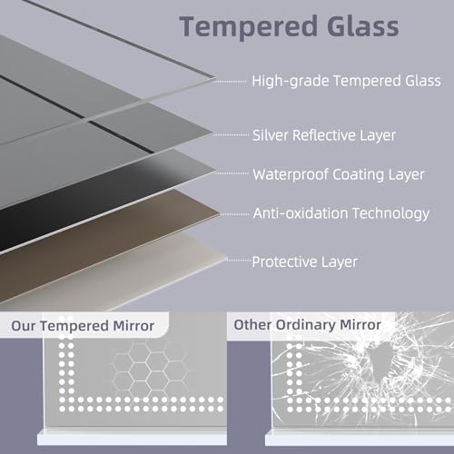 Sturdy Tempered Glass: Mirror with high-definition tempered glass, built in silver reflective layer, waterproof coating layer, anti-oxidation technology and protective layer. Led makeup mirror is durable and has a high safety index, making you more assured and comfortable