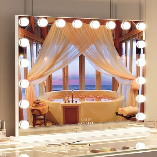 Lighted Makeup Mirror for Table and Wall- The size of the vanity mirror is 22.8″ x 31.5″, there are two nail back holes on the back of the LED mirror and a removable base, you can use Hollywood mirror with lights on the desk or hang the large mirror on the wall according to your preference