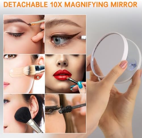 Detachable 10X Magnifying Mirror: Hollywood mirror comes with 10X magnification, much helpful to apply mascara, eyeliner, lipstick, etc., and also can be used as a portable travel makeup mirror to travel around.