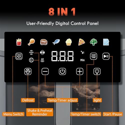 8-in-1 Versatility & Color Touchscreen for Effortless Cooking:Enjoy 8 versatile cooking presets for all your favorite dishes. The intuitive color touchscreen is responsive, easy to clean, and ensures precise temperature control (160℉ to 450℉), delivering perfectly cooked meals with enhanced flavor and texture every time.