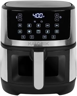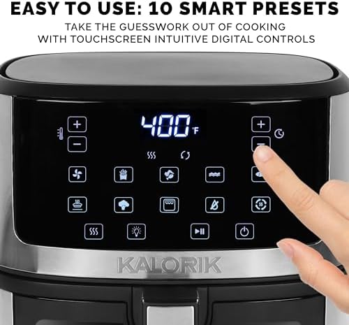 Create crispy, air-fried meals with the Kalorik 5-Quart Touchscreen Air Fryer. With a brightly lit viewing window for easy monitoring, this machine surrounds food in a whirlwind of hot air instead of oil to create a tender interior and crunchy finish. Enjoy easy digital menu selection, adjustable time and temperature (up to 400°F), and 10 smart presets. With the Kalorik 5-Quart Touchscreen Air Fryer, you can prepare nutritious meals and healthy air-fried favorites with just a few quick taps. The convenient viewing window and inner light let you know exactly when your food is ready, so you don’t have to open the drawer and disrupt the cooking process. Cook large portions or family-sized meals. A 5-quart capacity fits 1.5 lbs of frozen french fries or nuggets, 6 servings of wings, 3 (4 oz) hamburgers, or 3 (8 oz) pieces of salmon. The nonstick-coated basket and trivet are dishwasher-safe for quick cleanup. Stainless steel is on trend with modern kitchen decor and fits in flawlessly with your appliances.