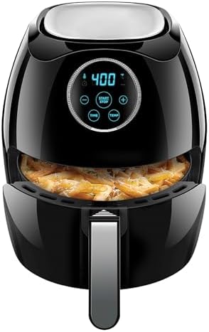 HEALTHIER FRYING: This air fryer makes healthy fried foods a reality. Temperature range from 175-400 F allo ws you to cook at your desired temperature, achieving a healthy, crispy, fried finish using at least 98 percent less oil than traditional fryers. Air fry vegetables, pizza, frozen foods and leftovers – this air fryer evenly crisps every inch of your food