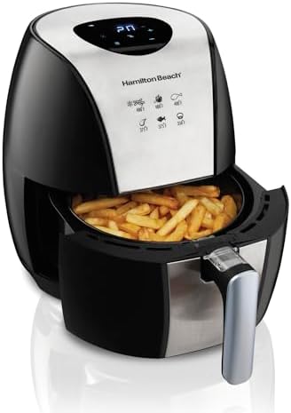 For fast cooking with little to no oil nothing beats an air fryer The Hamilton Beach 3 liter air fryer is perfect for people who love food with a crispy finish From French fries and potato wedges to chicken wings steaks baked goods and vegetables The Hamilton Beach 3 liter air fryer is the appliance to reach for when you want perfectly cooked food — and you want it fast You’ll find yourself using the Hamilton Beach 3 liter air fryer for everything from quick snacks and side dishes to family meals since it cooks food faster than a traditional oven Its 3 liter Capacity holds enough food for 2-4 people and when the cooking cycle completes the audible beep tells you when food is ready After cooking The removable nonstick basket makes cleanup easy