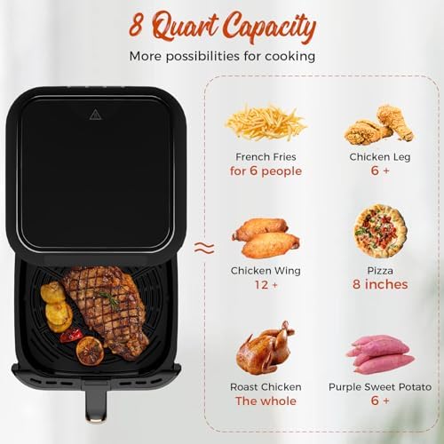 8 Preset One-click Intelligent Programs: one-click chicken leg, chips, fish, steak, cake, shrimp, chicken, pizza can be customized programs; In addition, the air fryer can also cook other foods, such as roasted vegetables, baked potatoes, and pumpkins